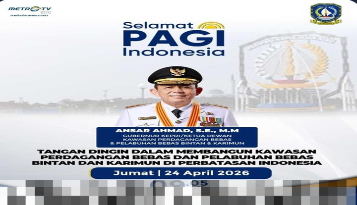 Acara penyerahan NGA 2026 ini akan disiarkan langsung oleh MetroTVNews pada Jumat, 24 April 2026, mulai pukul 19.30 WIB. Sebelum menerima penghargaan, Gubernur Ansar juga dijadwalkan tampil dalam program “Selamat Pagi Indonesia” di MetroTV pada pagi harinya, yang akan tayang pada pukul 09.00 WIB. Dalam dialog tersebut, tema yang diangkat adalah “Tangan Dingin Dalam Membangun Kawasan Perdagangan Bebas dan Pelabuhan Bebas Bintan dan Karimun di Perbatasan Indonesia.”